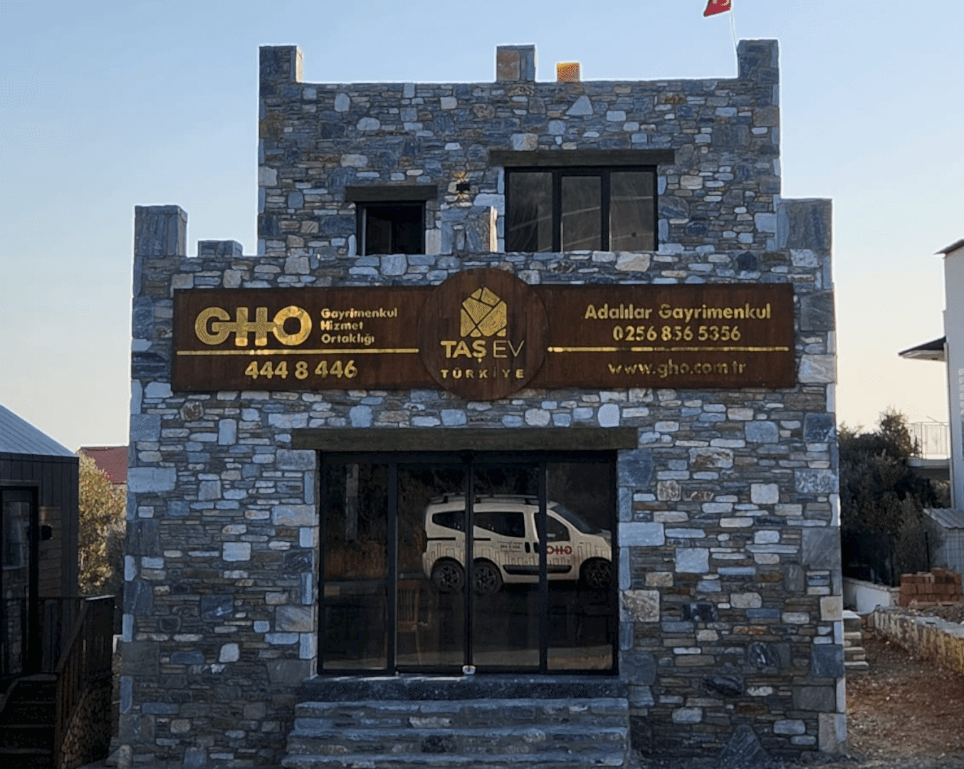 Taş Ev Türkiye tarafından inşa edilen GHO (Gayrimenkul Hizmet Ortaklığı) Adalılar Gayrimenkul Akbük ofisi, 300 m2 arsa üzerinde 110 m2 kullanım alanına sahip ofis ve 1+1 daireden oluşuyor.Teslim süresi ise 8 ay.